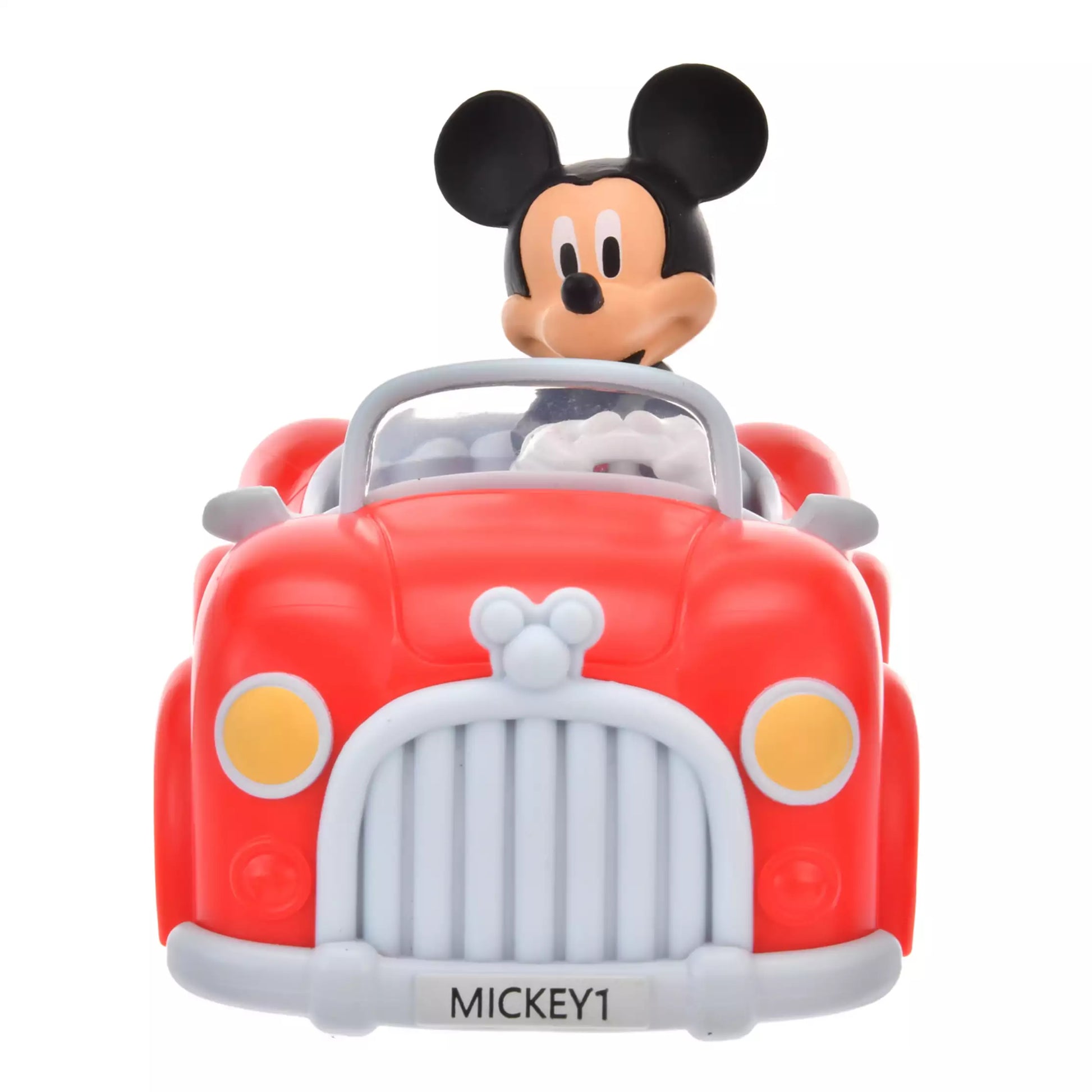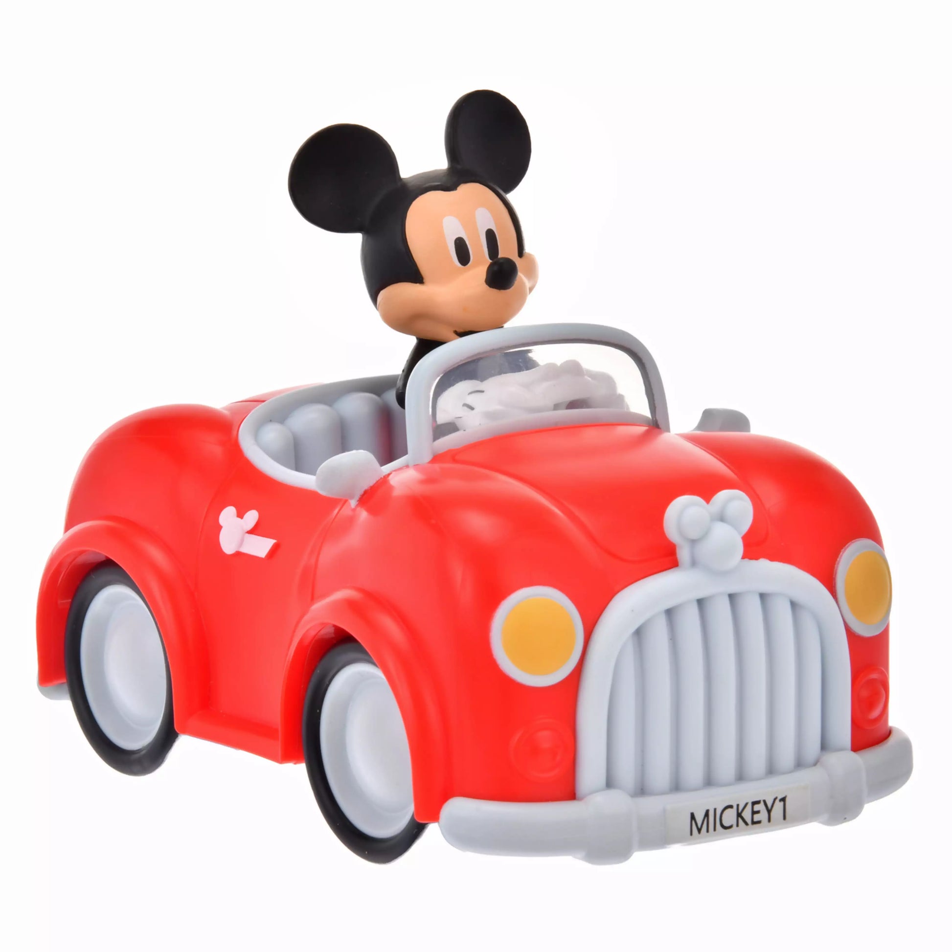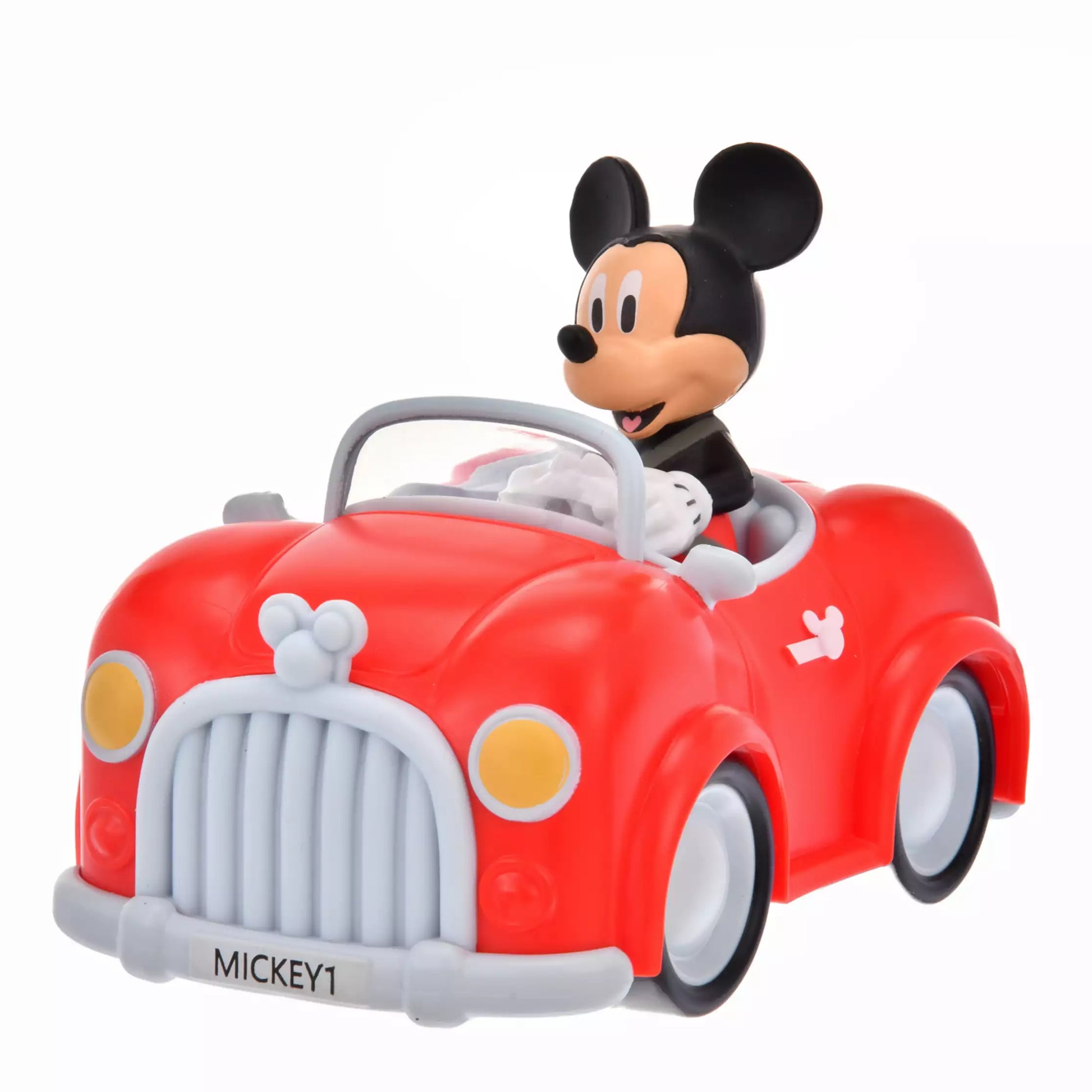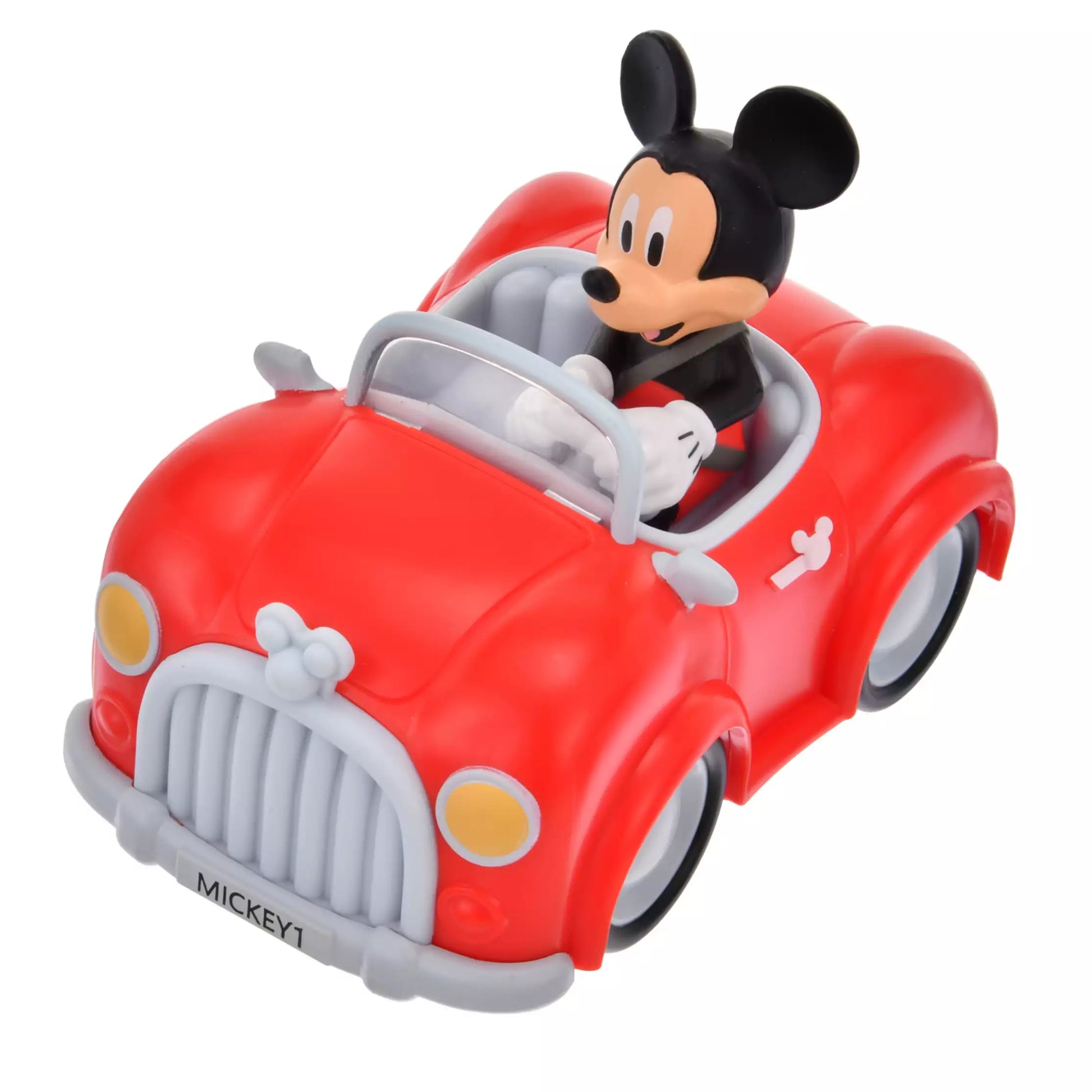 Mickey drives a bright red car with Mickey icons on the hood and body, and a personalized license plate.
