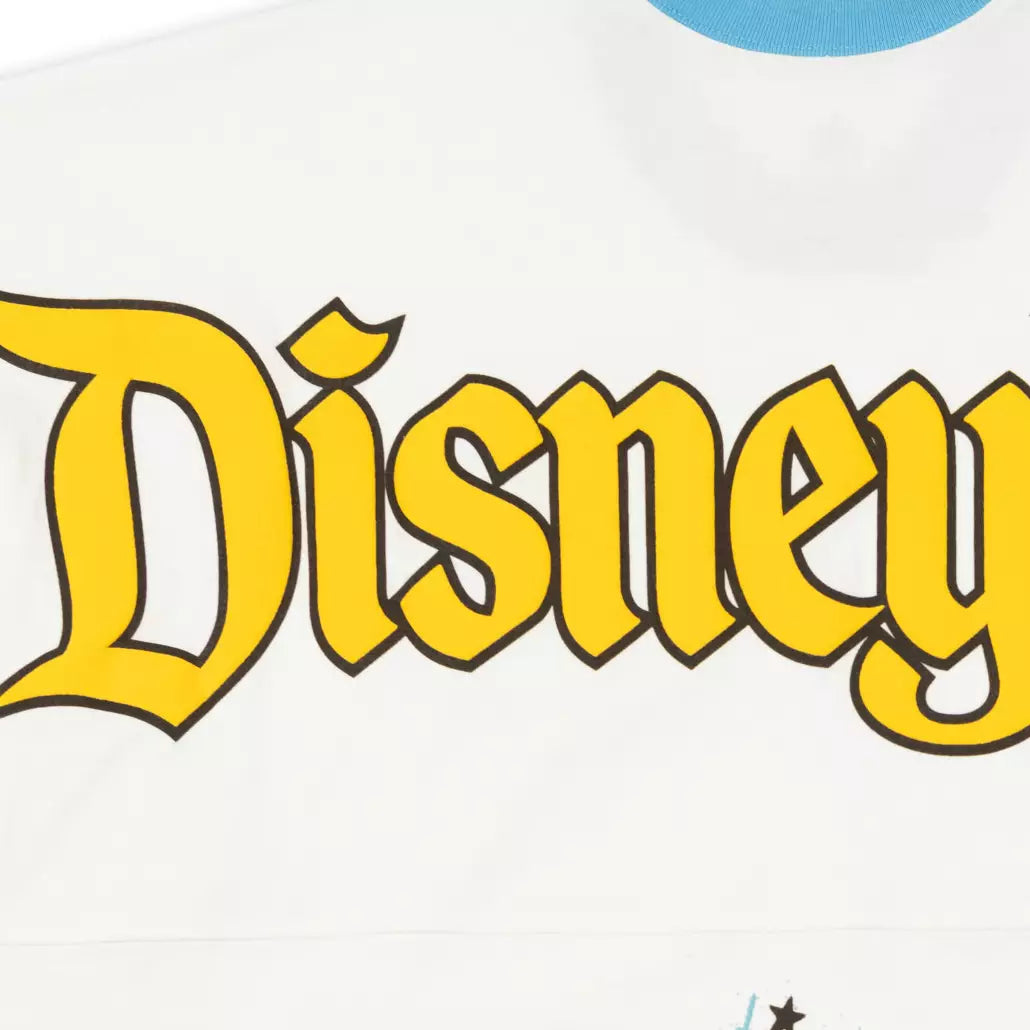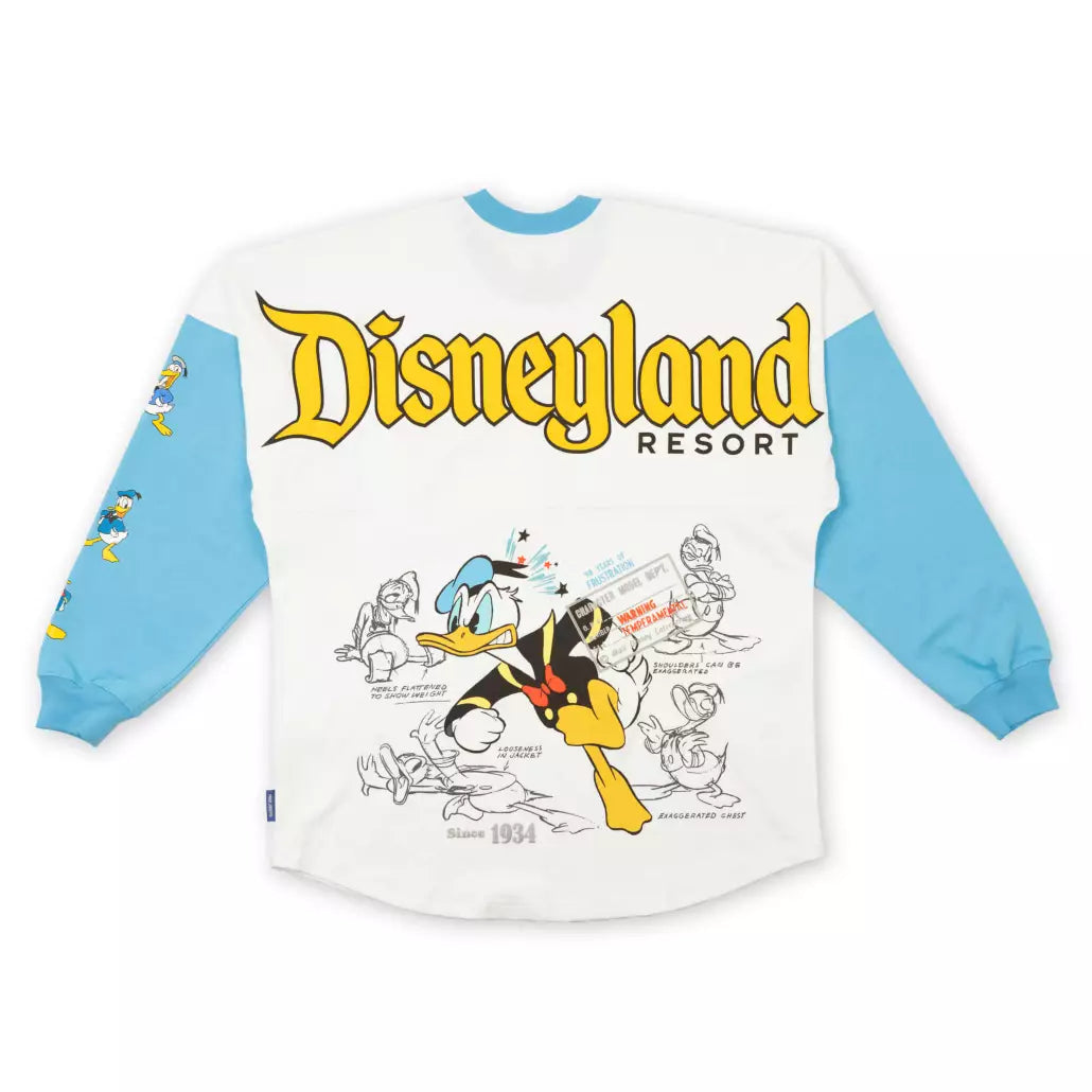 Celebrate 90 years of frustration and ruffled feathers in this commemorative Spirit Jersey honoring longtime cartoon favorite Donald Duck on his nine decade anniversary. Puffy accents and vintage Disney Studios art display Donald through the years on front, back and sleeve.