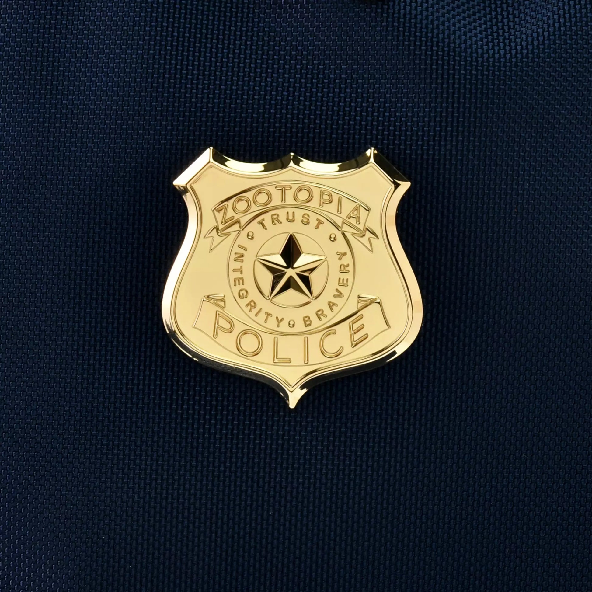 The navy blue backpack is inspired by a police uniform, and features die-cut parts with a police badge design.