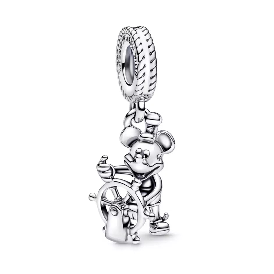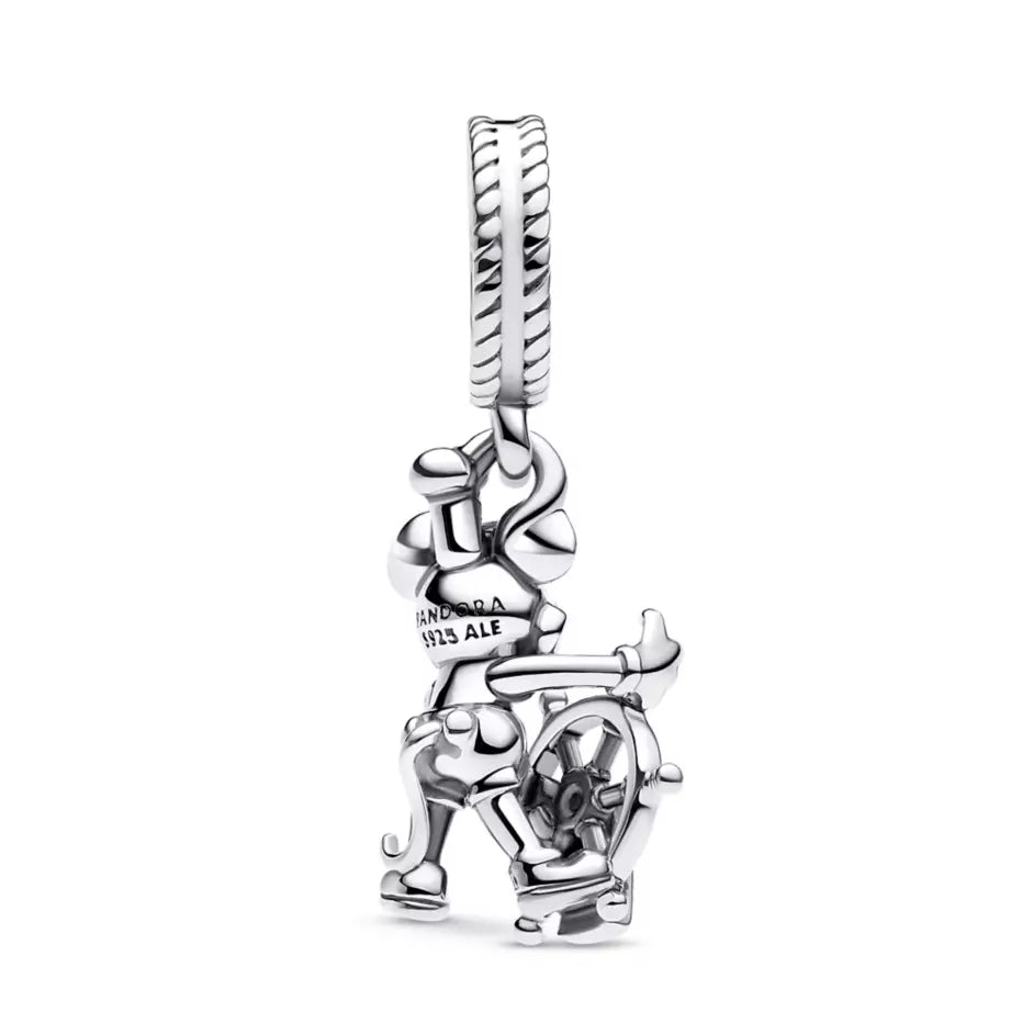 Fond memories of Mickey Mouse's film debut will always be on hand with this Steamboat Willie charm by Pandora. Crafted in sterling silver, the figural dangle design features Mickey piloting the steamboat in his famous 1928 role. Your collection will look shipshape when this addition navigates its way on to your Pandora bracelet.